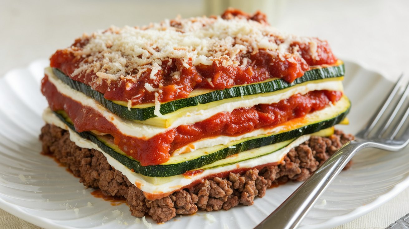 Each slice reveals vibrant colors, showcasing the harmonious blend of ground beef, marinara, zucchini, and cheese.